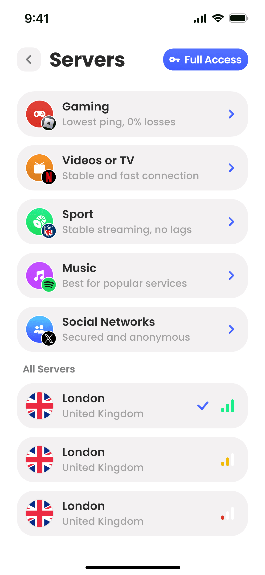 Choose servers by task — gaming, TV, music & more